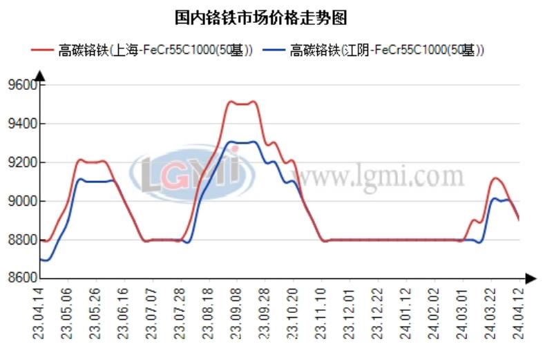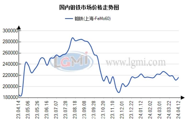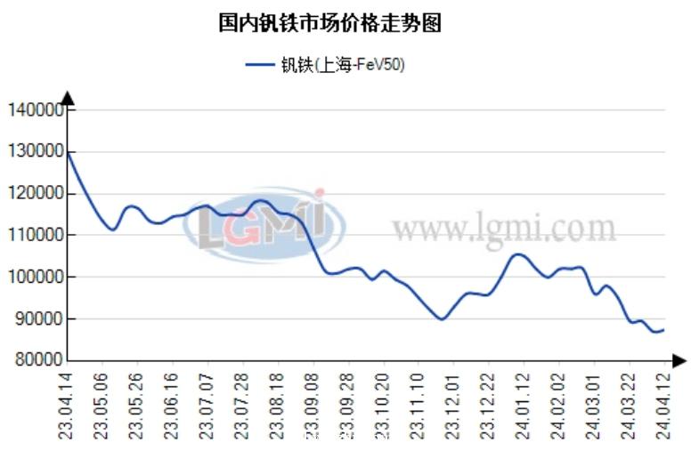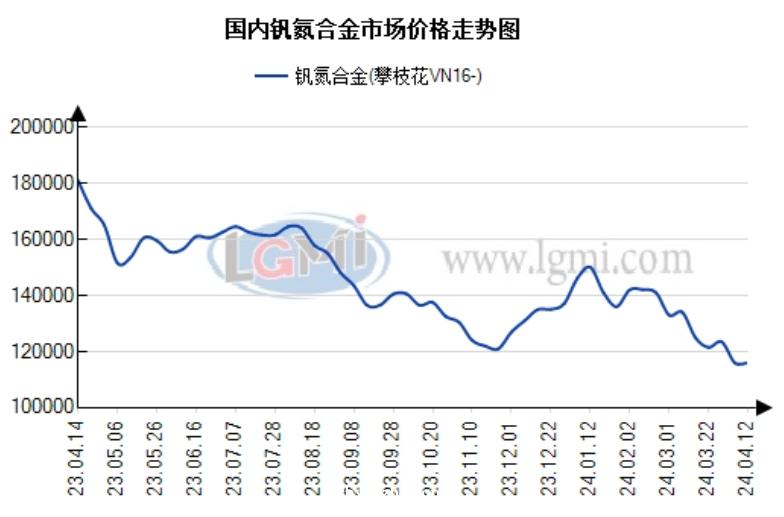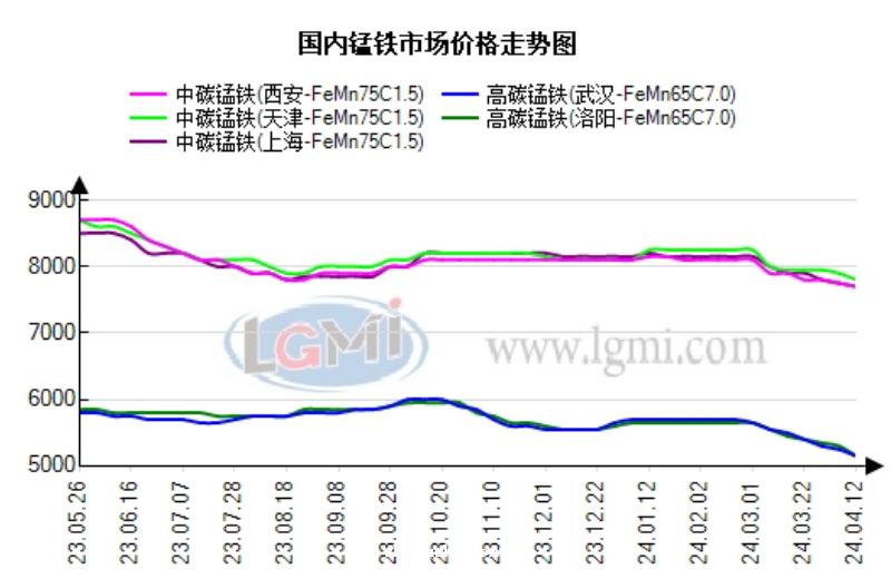 本周(4.8-4.12)铁合金市场价格震荡调整。据兰格钢铁网监测数据显示,西安地区FeMn75C1.5中碳锰铁报7700元,较上周价格跌50元;上海地区FeCr55C1000(50基)高碳铬铁报8900元,较上周价格跌100元;攀枝花地区VN16钒氮合金报116000元,较上周价格涨2000元;栾川地区现金价FeMo60钼铁报217000元,较上周价格涨8500元。