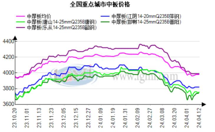 本周(4.8-4.12)国内中厚板市场价格涨跌互现,市场主流需求较上周有所好转,因期货盘面有所反弹,商家出货情绪较浓,价格跟进幅度较小。近期买方交易情绪增加,接单量较上周有所好转,大部分终端仍按需采购,目前市场普碳资源供需尚可,低合金仍表现供大于求格局。截止发稿,追踪国内十大重点城市价格均价为3829元,较上周五价格涨24元。其中重点城市邯郸、江阴价格分别为3760元与3820元,北方价格涨幅较大,南北价差有所缩小,资源流通仍有限制,北方资源发往南方较少,上海与唐山价差60元,江阴和邯郸价差在60元,各区域仍维持本地资源为主。