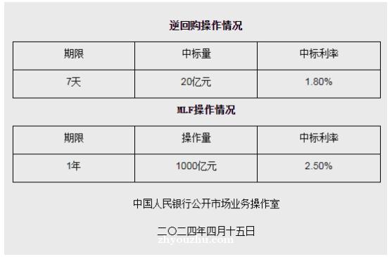 为维护银行体系流动性合理充裕,2024年4月15日人民银行开展20亿元公开市场逆回购操作和1000亿元中期借贷便利(MLF)操作。具体情况如下: