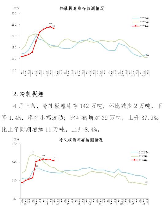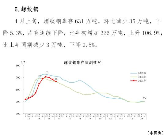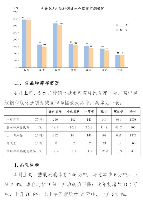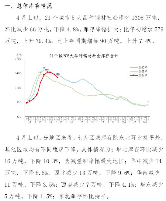 4月上旬,5大品种钢材社会库存1308万吨,环比下降4.8%
