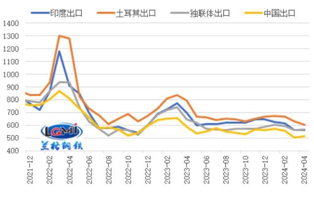 目前我国钢材出口报价优势仍存。兰格钢铁研究中心监测数据显示,截至2024年4月11日,印度、土耳其、独联体热轧卷板出口报价(FOB)分别为560美元/吨、605美元/吨和565美元/吨,中国热轧卷板出口报价(FOB)为515美元/吨;目前我国热卷出口报价分别较印度、土耳其、独联体热卷出口报价低45美元/吨、90美元/吨和50美元/吨(详见图4)。