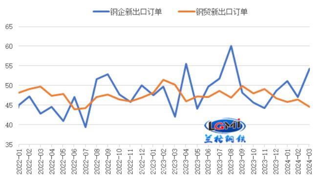 2024年3月份我国钢材出口仍呈现同比大幅增长态势。当前,我国钢材出口价格优势仍存;海外钢材市场供应同比继续回升,全球制造业指数进一步改善,外需有恢复态势,我国钢铁企业出口订单指数大幅回升至扩张区间运行,将对后期我国钢材出口形成一定带动。考虑到3月份我国钢材出口量近千万吨,创下7年多以来新高,兰格钢铁研究中心预计后期我国钢材出口量仍维持高位,或有望再破千万吨水平。