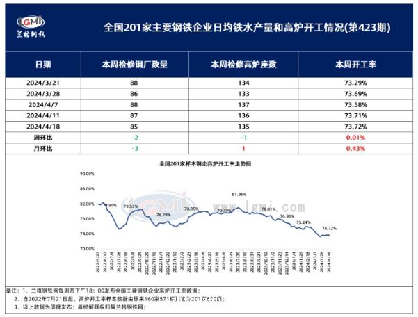 兰格调研:全国201家生产企业高炉开工数据周报(4月18日)