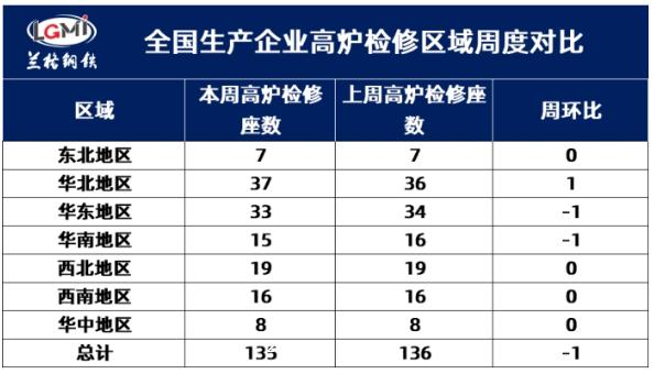 据兰格调研:201家样本高炉企业中,有135座高炉检修,较上周减少1座。其中:华北地区37座高炉检修,较上周增加1座;华东地区33座高炉检修,较上周减少1座;华南地区15座高炉检修,较上周减少1座;东北地区地区7座高炉检修、西北地区19座高炉检修、西南地区16座高炉检修、华中地区8座高炉检修,周环比均持平。