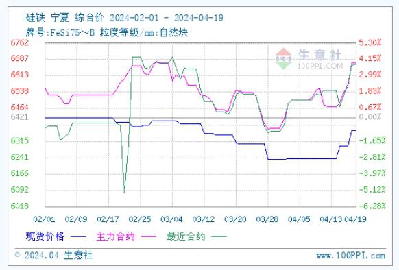硅铁期货行情震荡上行、原料兰炭、氧化铁皮价格上调消息均有传出,成本端仍有一定支撑、企业库存现货不多,部分排单生产为主、近期已出台招标价格止跌上行,在利好信息不断增加的情况下,业内信心得到明显提振,惜售情绪浓厚,市场报价上调。据生意社商品行情分析系统,4月19日硅铁(牌号:FeSi75~B;粒度等级/mm:自然块)宁夏地区市场报价在6300-6400元/吨,较上周涨150元/吨。