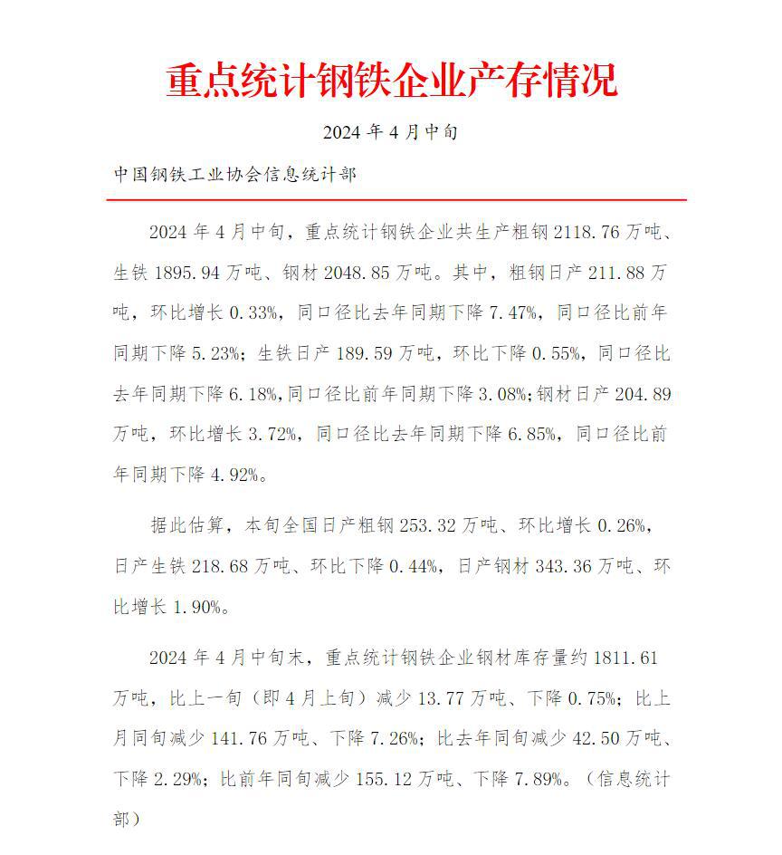中钢协:4月中旬,重点统计钢企粗钢日产211.88万吨,环比增长0.33%