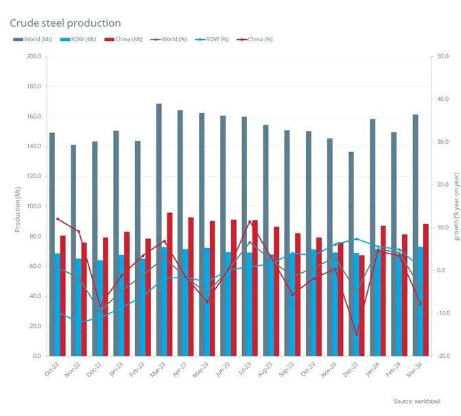 世界钢铁协会:3月全球粗钢产量为1.612亿吨