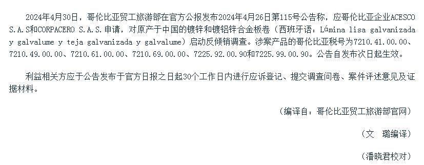 哥伦比亚对华镀锌和镀铝锌板卷启动反倾销调查