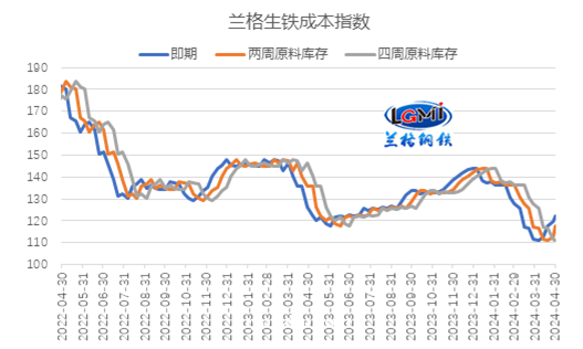 从月度均值表现来看,仍呈现下移态势。据兰格钢铁研究中心监测数据显示,2024年4月份即期原料成本指数为116.7,较上月同期下降2.5%;两周库存原料成本指数为114.0,较上月同期下降10.6%;四周原料库存成本指数为116.4,较上月同期下降12.8%。
