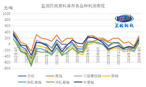 以四周原料库存测算各品种的毛利表现来看,随着前期原料价格的逐步见底,市场价格阶段性反弹,4月份四周库存原料测算品种毛利中,各品种毛利均有所改善;兰格钢铁研究中心监测数据显示,监测的七大品种月均盈利幅度在50-266元,均由亏转盈。