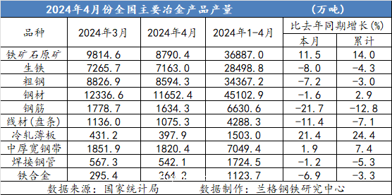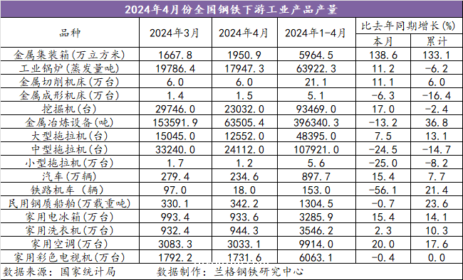 从各品种细分产量数据来看,2024年4月份钢材细分品类产量结构性分化态势依旧明显,建筑钢材类和管材类品种产量呈现同比下降的态势,而板材类品种产量呈现同比明显上升的态势(详见表1)。从主要下游产品产量数据来看,装备、汽车、船舶和家电等制造业用钢增量明显,与房地产和基建密切相关的工程机械等用钢需求呈现了明显改善的态势(详见表2),表明供给端呈现了“建材减量、板材增量”的态势,而需求端呈现了“地产和基建用钢需求改善、制造业用钢需求持续增强”的特征。