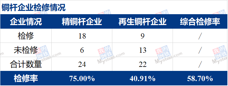 调研铜杆企业国庆期间实际检修情况显示,铜杆企业国庆期间实际综合检修率为58.70%,调研的46家铜杆企业中有27家进行了设备检修或停炉,剩余19家企业皆一直保持连续性生产。