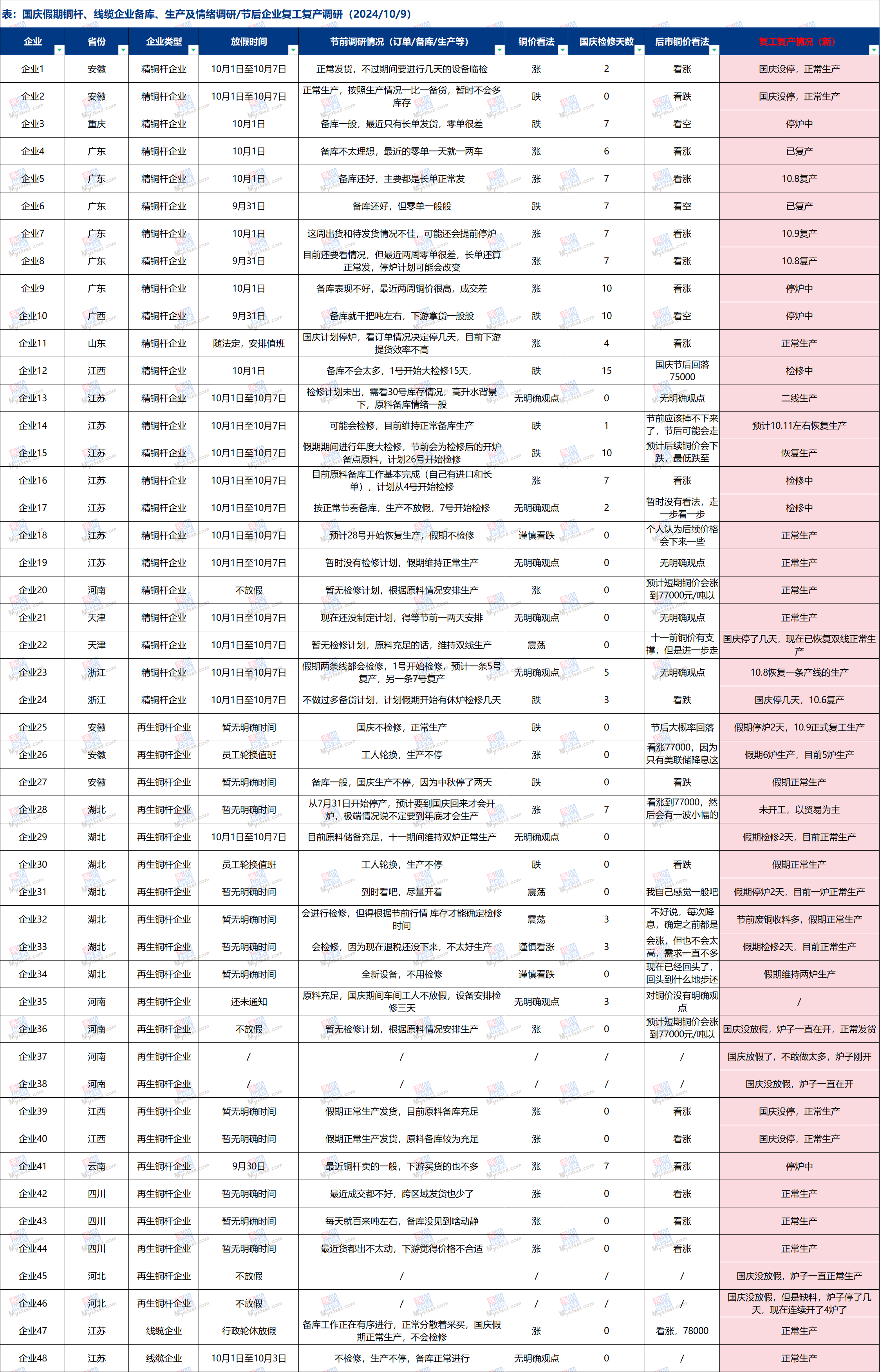 调研结果显示,截至2024年10月9日,调研的46家铜杆企业中合计共有37家企业现已恢复正常生产,综合复产率达80.43%,而剩余未复产的9家企业中以精铜杆企业为主,但部分企业也表示检修即将结束,因此铜杆企业复产率预计将在本周后半段大致达成100%的复产进度。