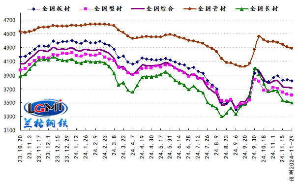 2024年第47周(2024.11.18-11.22)兰格钢铁全国绝对价格指数为3724元,与上周持平,较去年同期下降12.8%;其中,兰格钢铁长材绝对价格指数为3517元,较上周下降0.1%,较去年同期下降15.3%;兰格钢铁型材绝对价格指数为3620元,较上周下降0.7%,较去年同期下降13.4%;兰格钢铁板材绝对价格指数为3834元,较上周上升0.3%,较去年同期下降11.5%;兰格钢铁管材绝对价格指数为4308元,较上周下降0.9%,较去年同期下降6.3%。