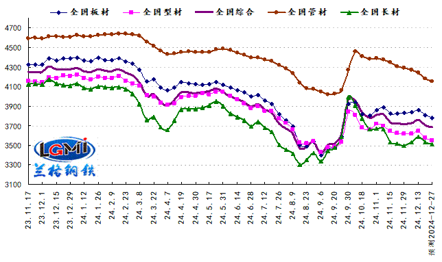 2024年第51周(2024.12.16-12.20)兰格钢铁全国绝对价格指数为3708元,较上周下降1.2%,较去年同期下降12.9%;其中,兰格钢铁长材绝对价格指数为3535元,较上周下降1.2%,较去年同期下降13.9%;兰格钢铁型材绝对价格指数为3574元,较上周下降1.9%,较去年同期下降14.3%;兰格钢铁板材绝对价格指数为3811元,较上周下降1.1%,较去年同期下降12.6%;兰格钢铁管材绝对价格指数为4177元,较上周下降1.5%,较去年同期下降9.2%。