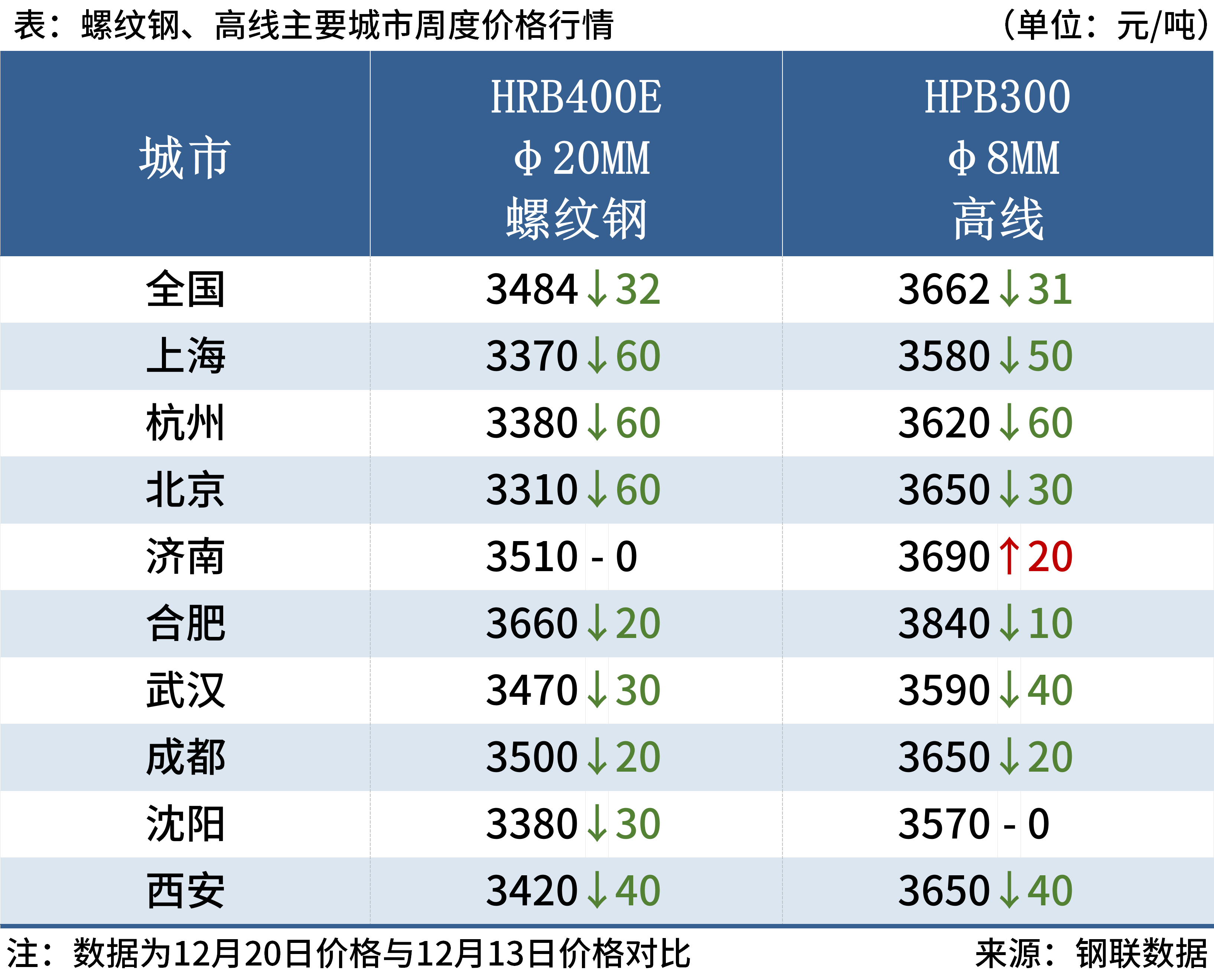 截至12月20日,全国主要城市20mm三级抗震螺纹钢均价3848元/吨,周环比跌32元/吨;8.0mmHPB300高线均价3662元/吨,周环比跌31元/吨。