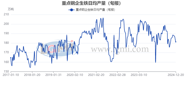 据中国钢铁工业协会统计数据显示,2024年12月中旬重点钢企生铁日均产量181.3万吨,旬环比下降1.6%,同比上升2.5%;12月中旬重点钢企粗钢日均产量197.7万吨,旬环比下降2.3%,同比下降0.1%;12月中旬重点钢企钢材日均产量196.8万吨,旬环比上升2.1%,同比上升0.3%。