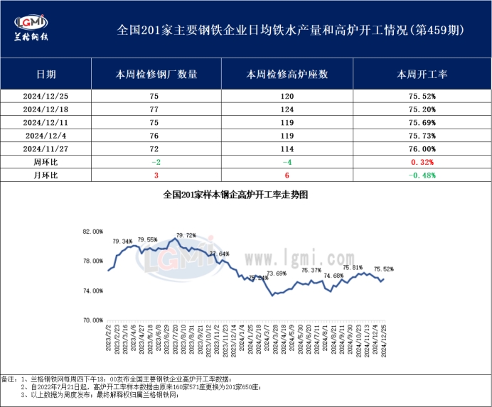 据兰格钢铁网监测数据显示,2024年12月25日全国201家生产企业中有75家钢厂共计120座高炉检修停产,总容积为124864立方米,较上周减少3420立方米,按容积计算主要钢铁企业高炉开工率为75.52%,较上周上升0.32%。