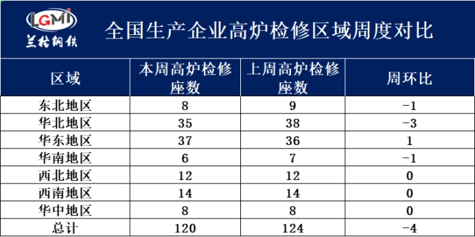 据兰格调研:201家样本高炉企业中,有120座高炉检修,较上周减少4座。其中:东北地区8座高炉检修,较上周减少1座;华北地区35座高炉检修,较上周减少3座;华东地区37座高炉检修,较上周增加1座;华南地区6座高炉检修,较上周减少1座;西北地区12座高炉检修,较上周持平;西南地区14座高炉检修,较上周持平;华中地区8座高炉检修,较上周持平。