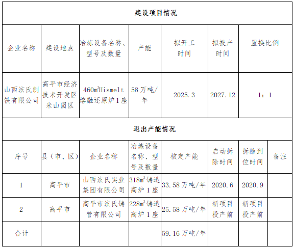 关于山西泫氏制铁有限公司建设项目产能置换方案的公示