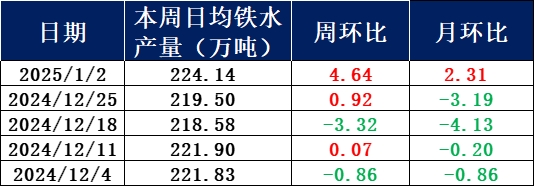 2025年1月2日,据兰格调研,全国201家生产企业铁水日均产量为224.14万吨,周环比增加4.64万吨,总体月环比增加2.31万吨;11月日均铁水产量为222.55万吨,12月日均铁水产量为220.45万吨,1月日均铁水产量为224.14万吨。从数据来看,本周全国钢厂日铁水总产量较上周小幅增加,其中主要增量区域集中在华南区域,主要是因区域内部分高炉存在小幅增产操作而影响;而东北区域及西南区域部分高炉存在减产操作,铁水日产量较上周小幅减少;其他区域铁水量较上周暂无明显变化。