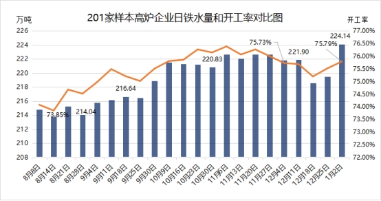 兰格调研:全国201家生产企业日均铁水产量增加(1月2日)