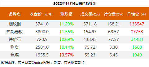 截至9月14日收盘,螺纹钢2301收3741元/吨,跌1.29%;热卷2301收3800元/吨,跌1.55%;铁矿石2301收720.5元/吨,跌0.69%;焦炭2301收2581/吨,跌0.14%;焦煤2301收1955.5元/吨,涨0.57%。