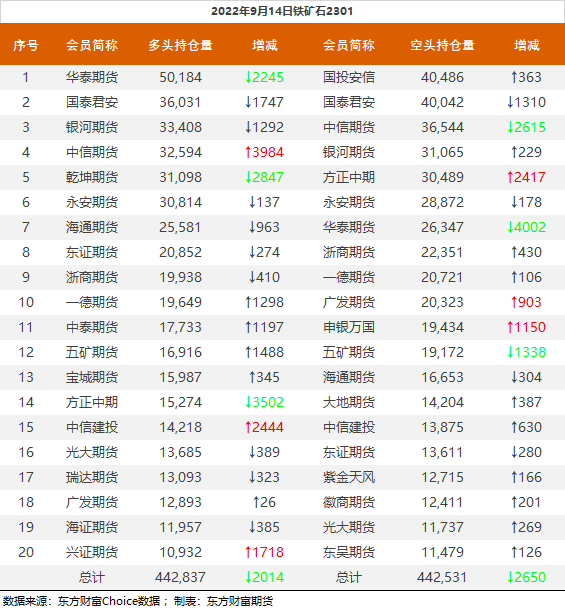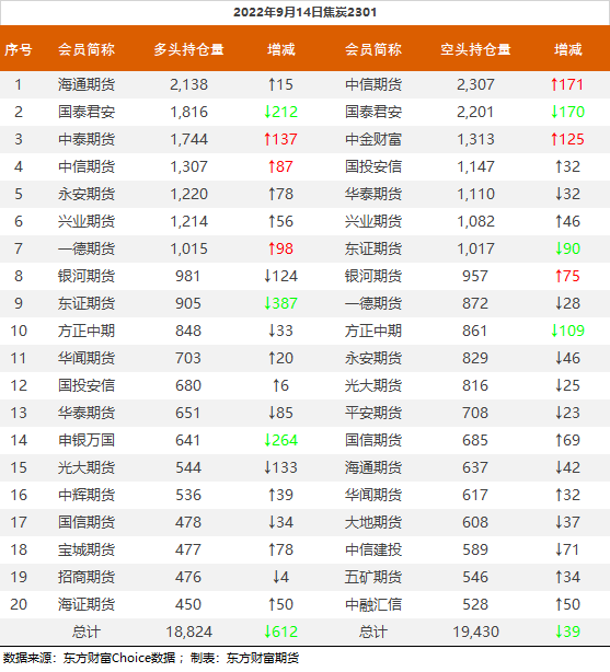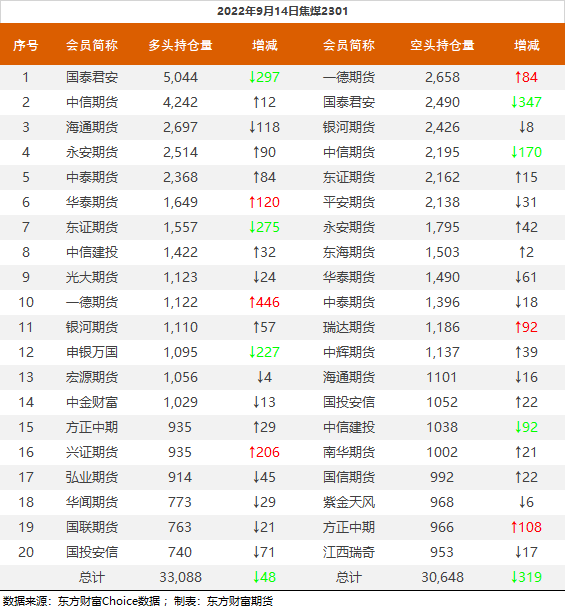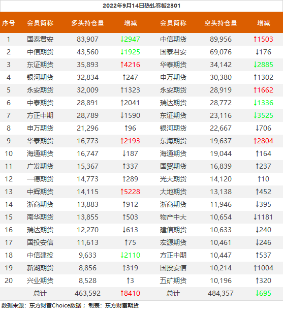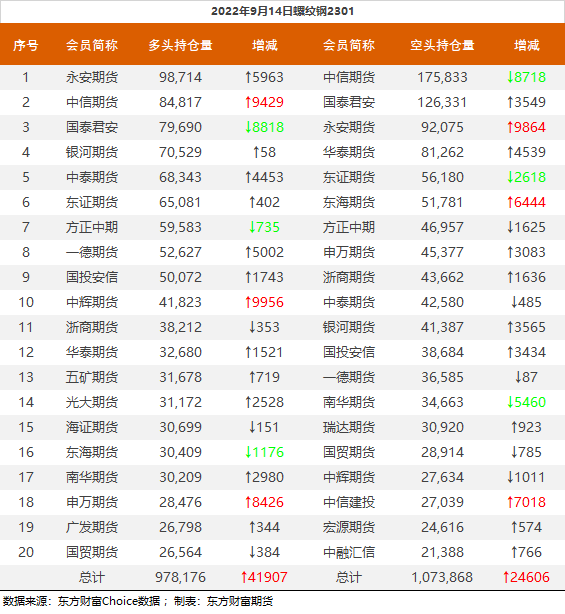 螺纹钢2301合约前20席位多单增仓41907手至97.8万余手,空单增仓24606手至107.3万余手,整体净空95692手。其中中信期货多单增持9429手,空单减持8718手,整体净空91016手。