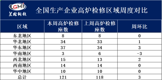 据兰格调研:201家样本高炉企业中,有121座高炉检修,较上周增加3座。其中:东北地区8座高炉检修,较上周持平;华北地区34座高炉检修,较上周增加1座;华东地区37座高炉检修,较上周增加3座;华南地区3座高炉检修,较上周减少3座;西北地区15座高炉检修,较上周增加2座;西南地区14座高炉检修,较上周持平;华中地区10座高炉检修,较上周持平。