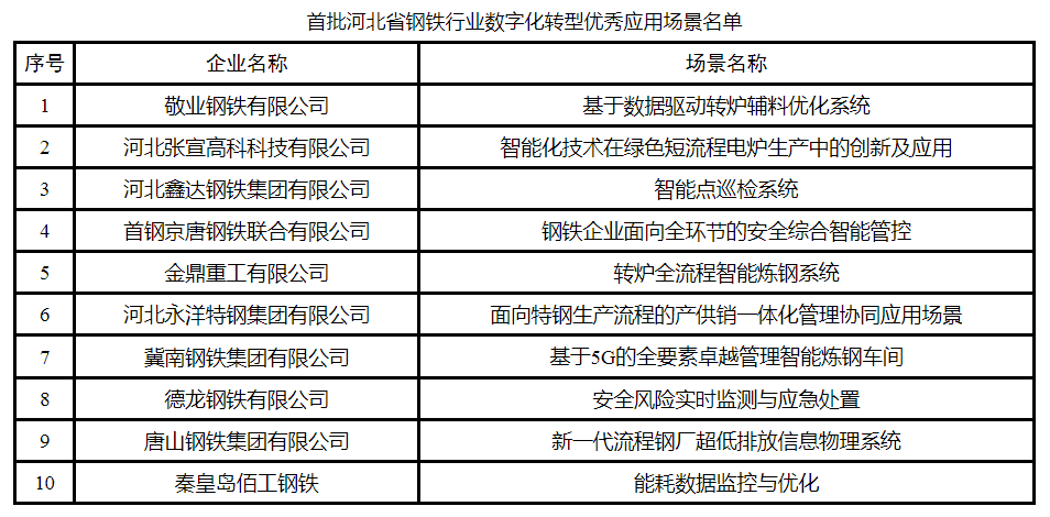 河北工信厅公示首批河北省钢铁行业数字化转型优秀应用场景名单