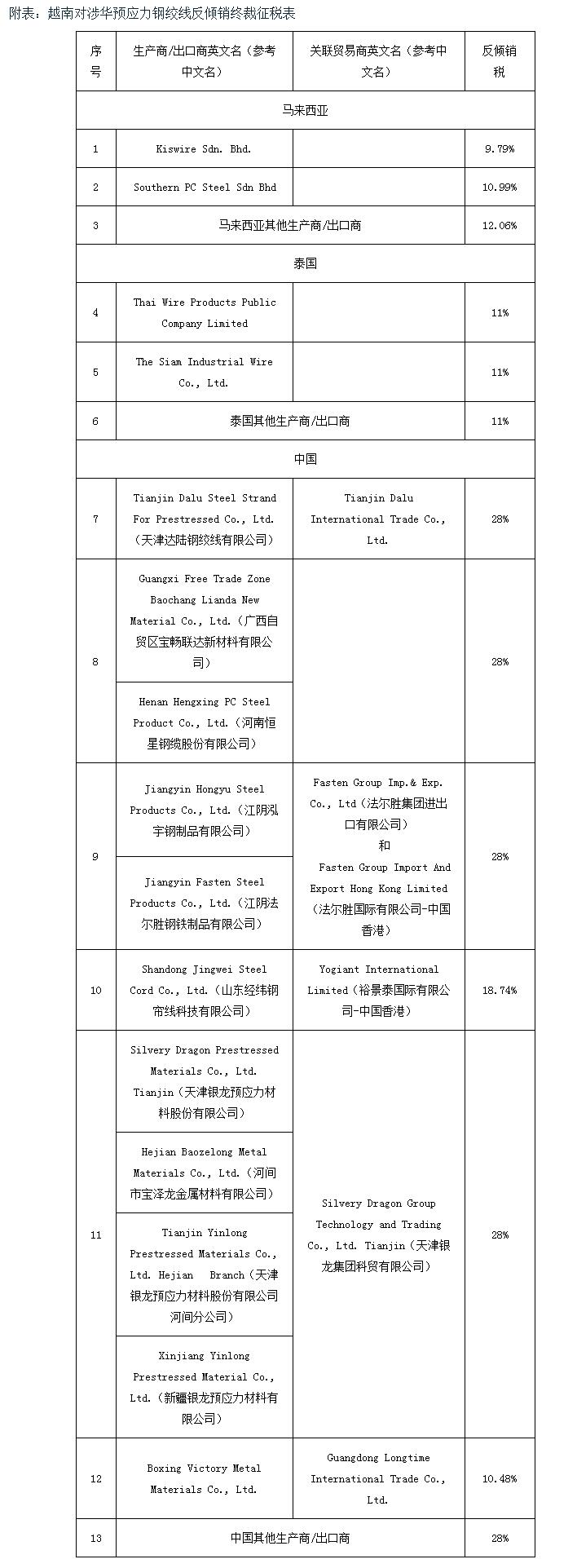2025年1月14日,越南工贸部发布第143/QD-BCT号公告,对原产于马来西亚、泰国和中国的预应力钢绞线作出反倾销肯定性终裁,决定对涉案企业征收9.79%~28%的反倾销税(详见附表),其中,中国涉案企业税率为10.48%~28%。本案涉及越南税号7312.10.91和7312.10.99项下的产品。措施自公告发布之日起15日后生效,有效期为五年。