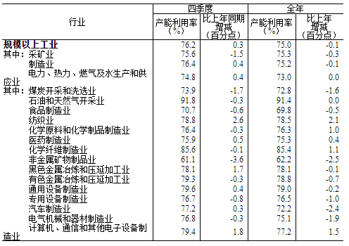 分主要行业看,2024年四季度,煤炭开采和洗选业产能利用率为73.9%,食品制造业为70.7%,纺织业为78.8%,化学原料和化学制品制造业为76.4%,非金属矿物制品业为61.1%,黑色金属冶炼和压延加工业为78.1%,有色金属冶炼和压延加工业为79.3%,通用设备制造业为79.6%,专用设备制造业为76.7%,汽车制造业为77.2%,电气机械和器材制造业为76.8%,计算机、通信和其他电子设备制造业为79.4%。