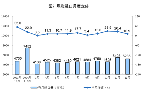 原煤生产增速加快。12月份,规上工业原煤产量4.4亿吨,同比增长4.2%,增速比11月份加快2.4个百分点;日均产量1415.6万吨。进口煤炭5235万吨,同比增长10.9%。