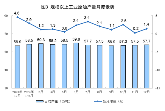原油生产增速加快。12月份,规上工业原油产量1790万吨,同比增长1.4%,增速比11月份加快1.2个百分点;日均产量57.7万吨。进口原油4784万吨,同比下降1.1%。