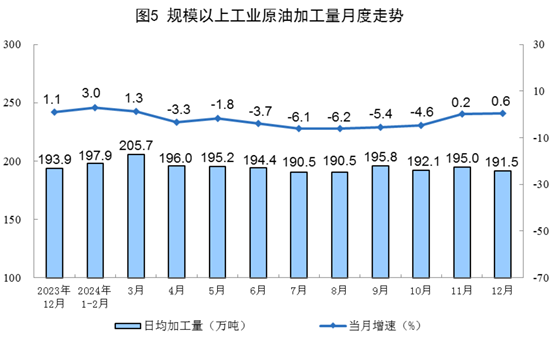 原油加工保持稳定。12月份,规上工业原油加工量5935万吨,同比增长0.6%,增速比11月份加快0.4个百分点;日均加工191.5万吨。2024年,规上工业原油加工量70843万吨,同比下降1.6%。