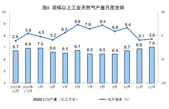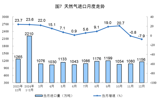 天然气生产稳步增长。12月份,规上工业天然气产量218亿立方米,同比增长3.6%,增速比11月份加快0.5个百分点;日均产量7.0亿立方米。进口天然气1156万吨,同比下降7.9%。
