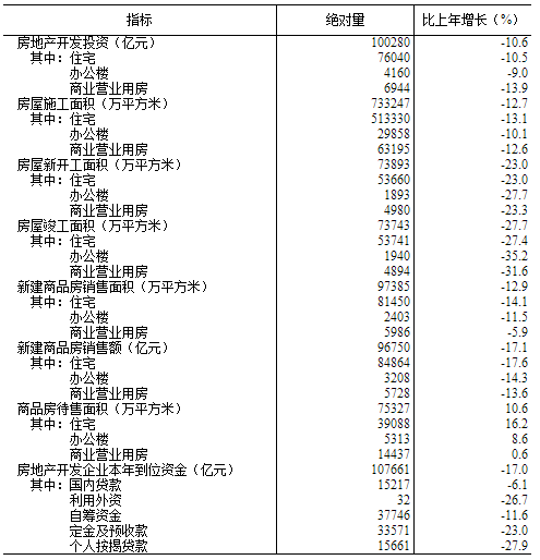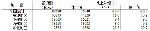 2024年,全国房地产开发投资100280亿元,比上年下降10.6%(按可比口径计算,详见附注6);其中,住宅投资76040亿元,下降10.5%。