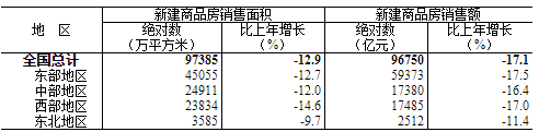 2024年,新建商品房销售面积97385万平方米,比上年下降12.9%,其中住宅销售面积下降14.1%。新建商品房销售额96750亿元,下降17.1%,其中住宅销售额下降17.6%。
