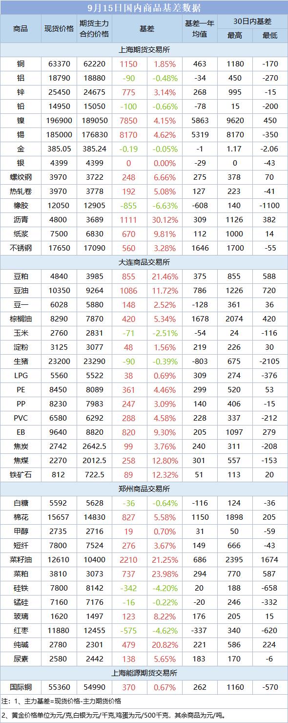 9月15日国内商品基差数据一览