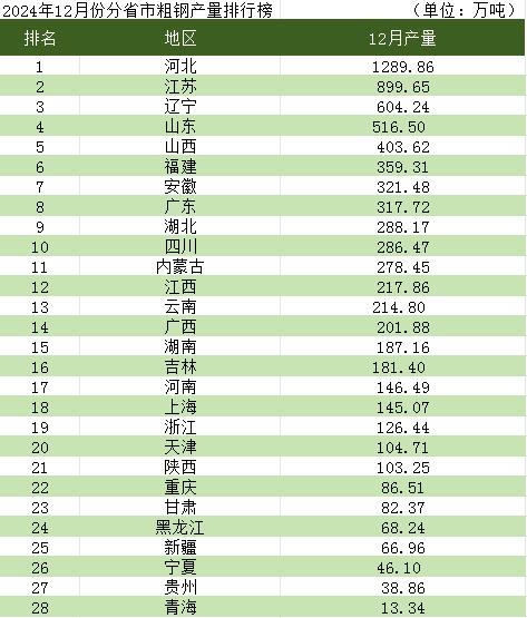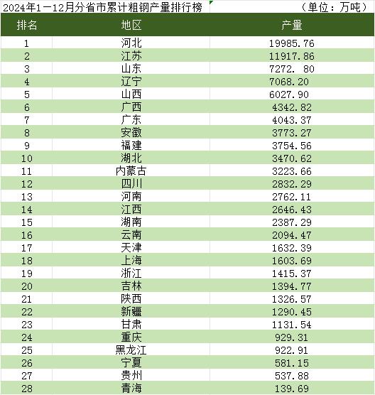 从分省市数据来看,2024年12月份粗钢产量前三名为河北、江苏、辽宁,产量分别为1289.86万吨、899.65万吨、604.24万吨;2024年1—12月分省市累计粗钢产量前三名为河北、江苏、山东,产量分别为19985.76万吨、11917.86万吨、7272.80万吨。