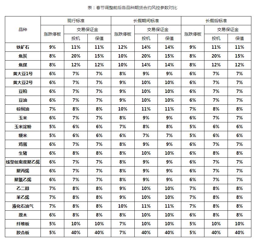 铁矿石、焦炭、焦煤、黄大豆1号、黄大豆2号、豆粕、豆油、棕榈油、玉米、玉米淀粉、粳米、鸡蛋、生猪、线型低密度聚乙烯、聚丙烯、聚氯乙烯、乙二醇、苯乙烯、液化石油气、原木、纤维板和胶合板品种期货合约涨跌停板幅度和交易保证金水平恢复至节前标准。