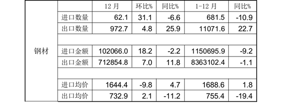 2024年12月,我国出口钢材972.7万吨,环比增长4.8%,出口均价732.9美元/吨,环比小幅回升2.1%。1-12月,我国累计出口钢材11071.6万吨,同比增长22.7%,出口均价755.4美元/吨,同比下降19.4%。12月,我国进口钢材62.1万吨,环比增长31.1%,进口均价1644.4美元/吨,环比下降9.8%。1-12月,我国累计进口钢材681.5万吨,同比下降10.9%,进口均价1688.6美元/吨,同比增长1.8%。