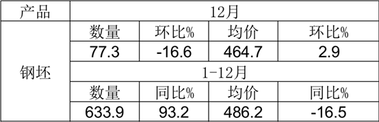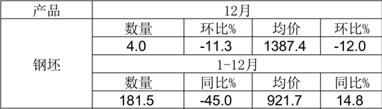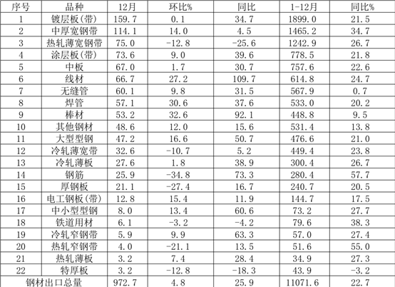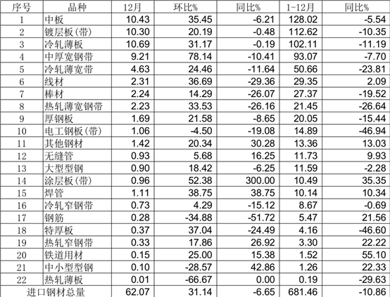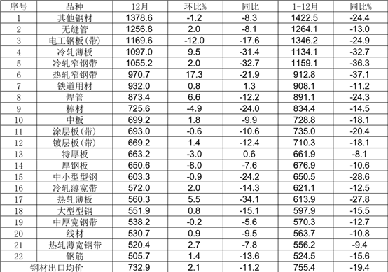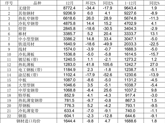 12月,22大类钢材品种中,有18类品种进口量环比增长,增幅较大;管材、涂层板等品种出口价格环比下降幅度较大。