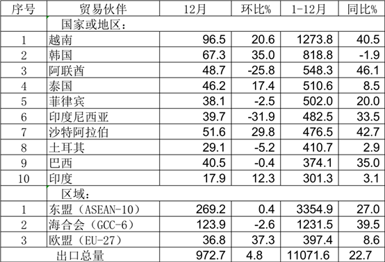 12月,向东盟出口钢材环比小幅增长,其中向越南、泰国出口环比增幅较大,向菲律宾和印度尼西亚出口环比下降。向海合会出口钢材环比小幅下降,其中向阿联酋出口环比大幅下降,但向沙特阿拉伯出口环比大幅增长。受欧盟季度配额影响,12月向欧盟出口环比大幅增长。
