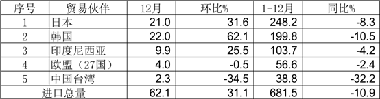 钢材进口来源持续稳定,12月自日本、韩国和印度尼西亚进口钢材数量环比增幅较大,自中国台湾进口持续下降。日本、韩国和印度尼西亚是我钢材进口的主要来源,2024年自上述三国进口占我国钢材进口总量的81.0%。