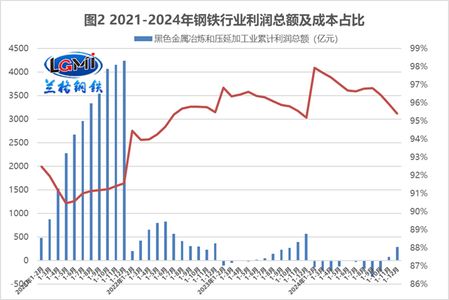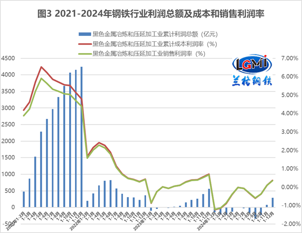 2024年,受到国内外经济环境变化、国内下游需求不足、供需矛盾突出、成本支撑偏弱等因素影响,国内钢材市场仍呈现震荡下行局面,但原料成本维持在相对低位,使得钢厂全年保持持续盈利。根据国家统计局发布数据显示,2024年黑色金属冶炼和压延加工业盈利291.9亿元,同比下降54.6%。从单月利润数据来看,2024年钢铁行业单月利润呈现“先亏损、再减亏、再亏损、再盈利”的态势,其中1-2月亏损146.1亿元,3月份亏损67.5亿元,4月份亏损8.6亿元,5月份盈利95亿元,6月份盈利124.1亿元,7月份亏损24.5亿元,8月份亏损142.1亿元,9月份亏损171.3亿元,10月份盈利107.8亿元,11月份盈利311.8亿元,12月份盈利213.3亿元。从季度利润数据来看,2024年国内钢铁行业季度利润呈现“亏损和盈利”二次循环,其中一季度亏损213.6亿元,二季度盈利210.5亿元,三季度亏损337.9亿元,四季度盈利632.9亿元。