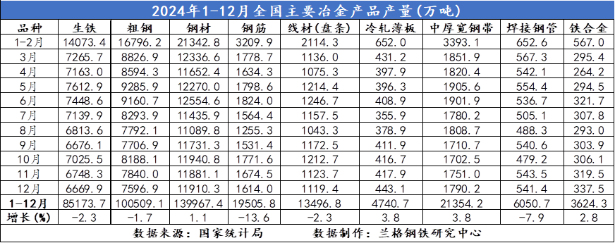 从各品种细分产量数据来看,2024年1-12月,在生铁和粗钢产量同比下降、钢材产量同比上升的局面下,钢材细分品类产量结构性分化特征依然明显;其中建筑钢材类中的钢筋产量同比降幅最大,线材产量同比降幅相对较小;同时管材类产量同比也明显下降,但板材类品种产量同比维持小幅增长态势(详见表1)。