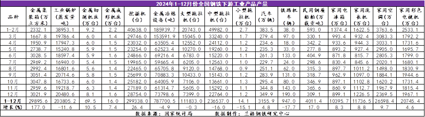 表2 2024年1-12月全国钢铁下游工业产品产量