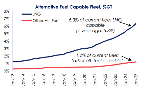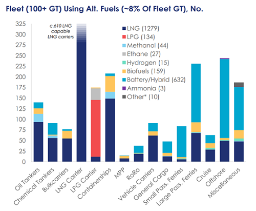 根据克拉克森的数据,整体而言按吨位计算,截至目前在运营船队中能够使用替代燃料或推进装置船舶的比例已经提高到了7.6%,高于2017年的2.5%和2023年年初的5.3%。在现有总计2170艘替代燃料船舶中,包括1279艘LNG动力船、44艘甲醇动力船、134艘LPG动力船、632艘电池/混合动力推进船,此外还有214艘采用其他燃料。