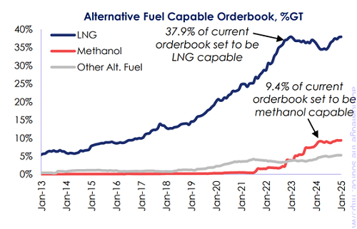 DNV指出,过去三年来替代燃料船舶订单的增长主要得益于集装箱船和汽车运输船的新造船热潮。2024年,这两种船型合计占所有替代燃料船舶订单的62%。2024年,69%的集装箱船订单是能够使用替代燃料的船舶,该船型的首选燃料则是LNG(67%)。